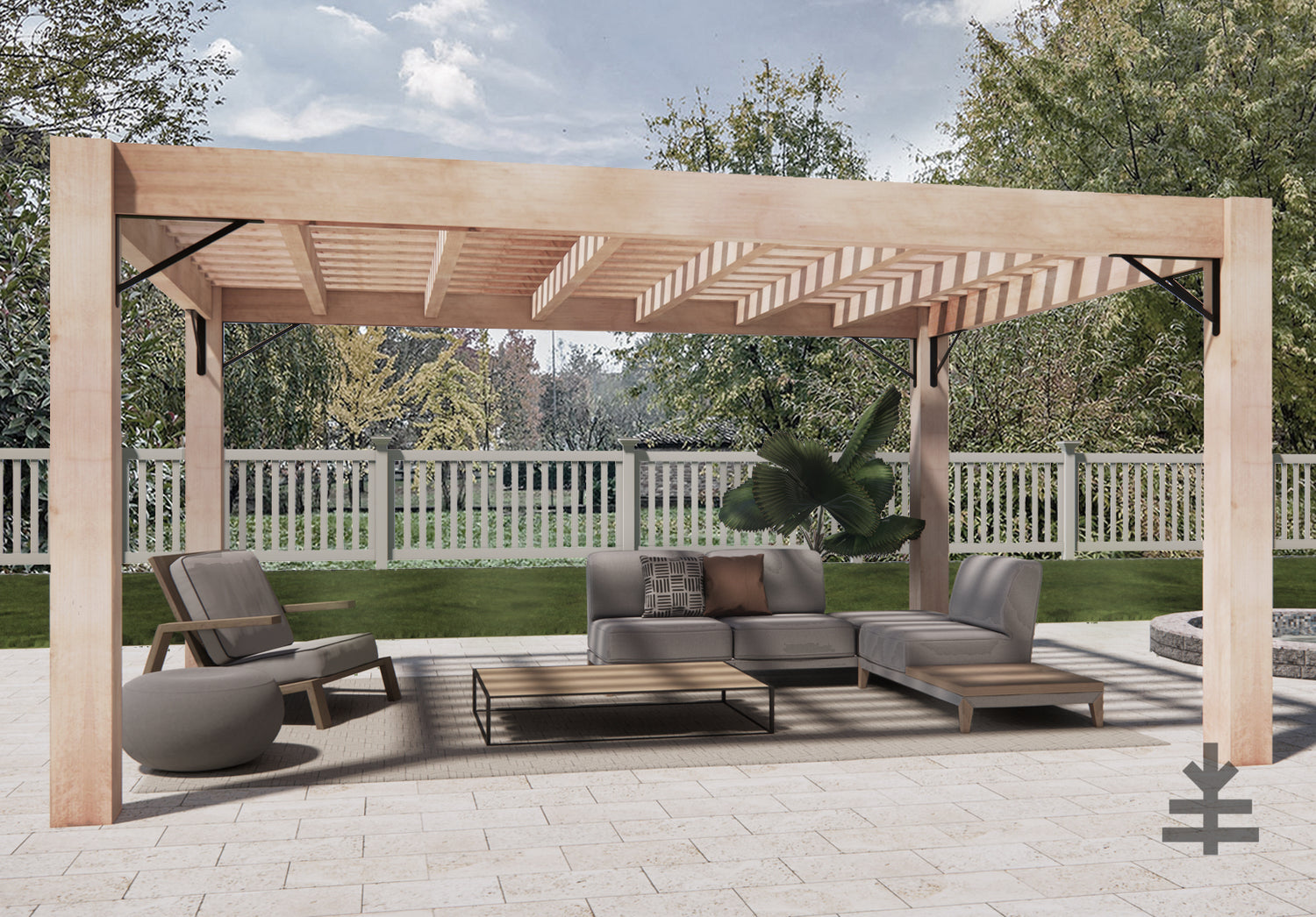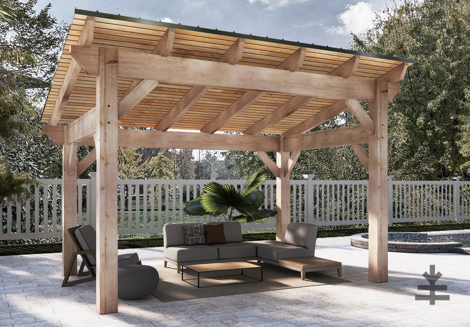 Okay, so what we mean by all this naked stuff is pretty simple. We provide the bare essentials for a quality timber shade structure. We cut the raw wood, using traditional dovetail joinery, into a simple kit. By leaving the nakedTREEpergola kit in its natural state, you can choose how or if you finish the wood; sanding, routing, stain finishing, aging solution, sealer, or letting it age for a distinguished and truly natural look. We offer a selection of popular sizes to fit a variety of spaces and preferences, without the added cost and time of a custom timber structure.