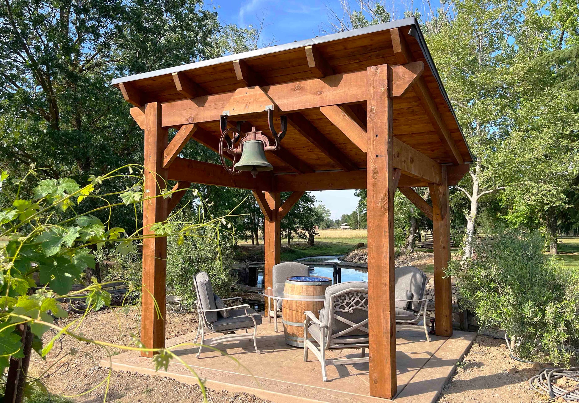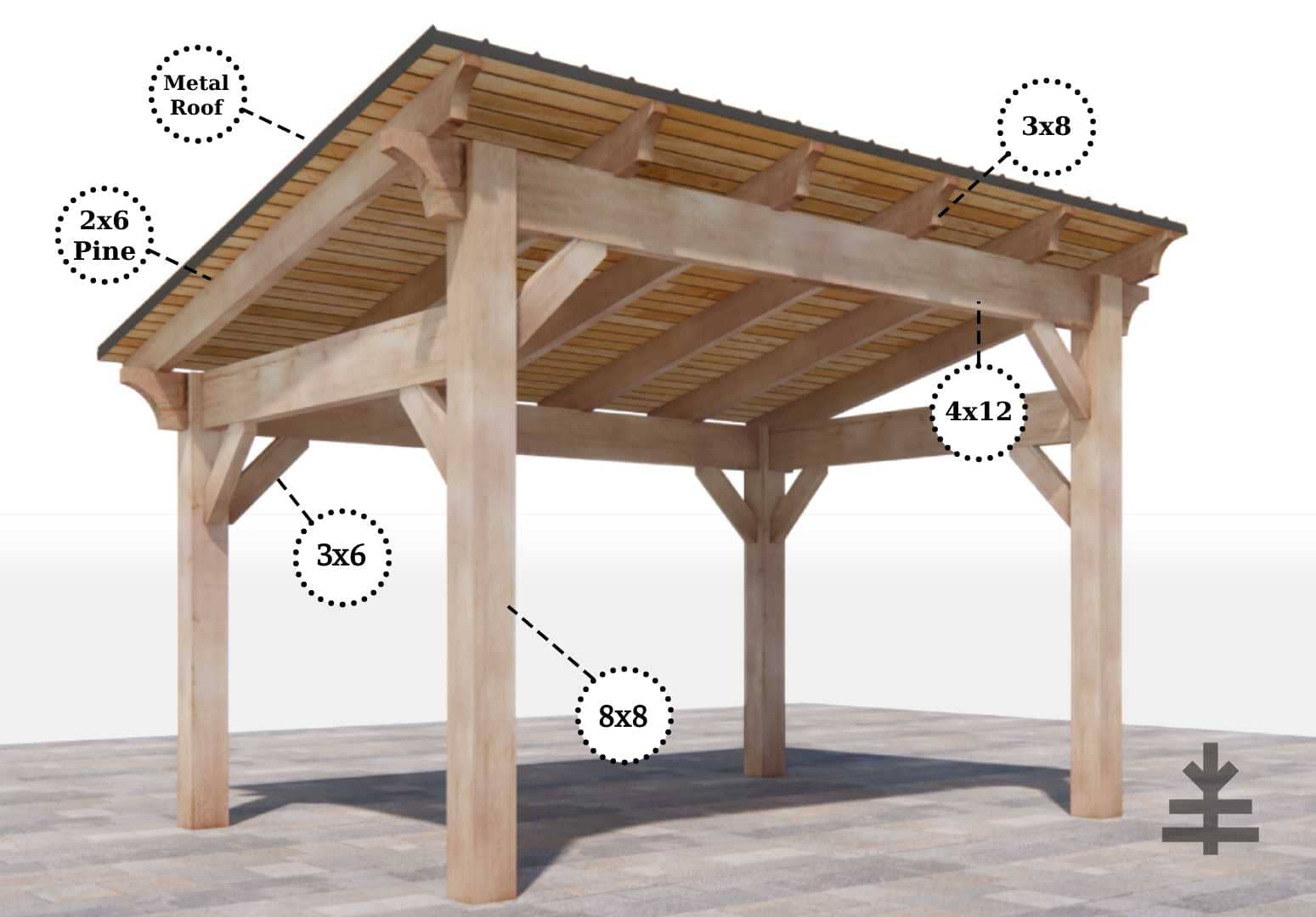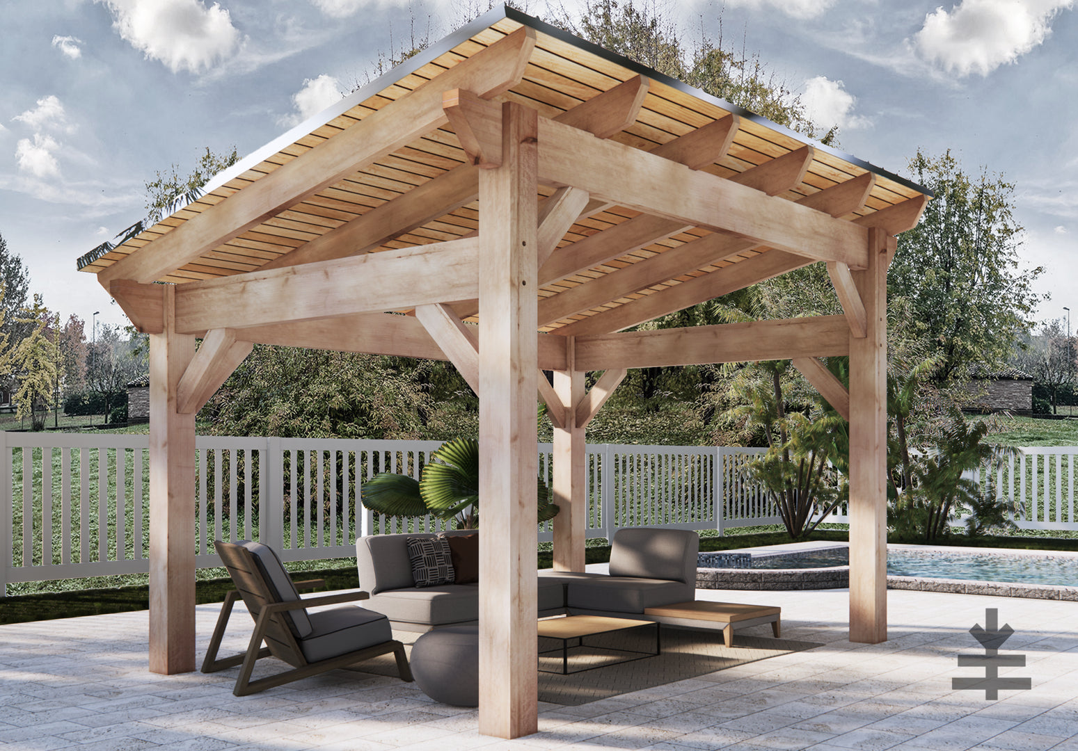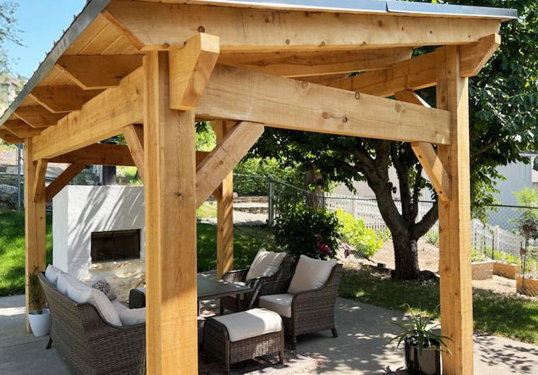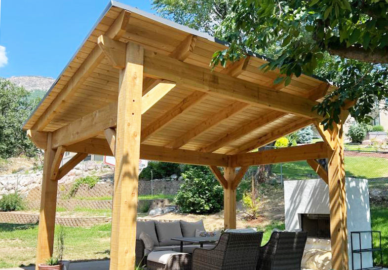 Natural Incense Cedar Timber Frame gazebo Kit hand crafted by Notched. Offers the bare essentials for a quality timber shade structure. The Naked Tree Pergola Covered pavilion is the perfect DIY solution for your backyard project. Dovetail joinery makes it naturally easy to assemble.  All covered structures come standard with structural pine tongue and grove ceiling, and grey metal roofing panels.  All mounting hardware and simple assembly instructions included.